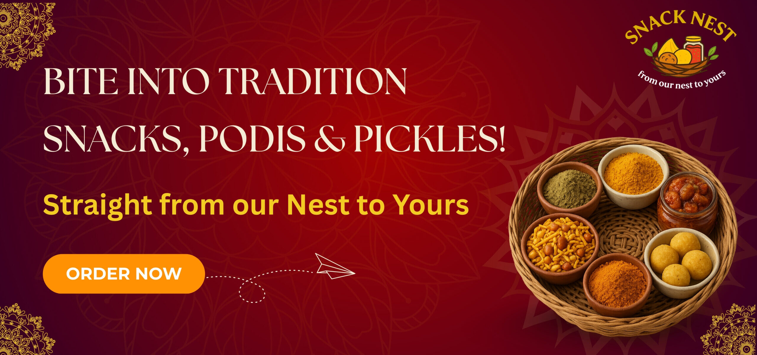 Established in May 2025, Snack Nest was born out of a simple love for homemade food — the kind that’s prepared with care, rooted in tradition, and full of flavor. We specialize in handcrafted snacks, pickles, and podis, made in small batches with authentic ingredients and time-honored recipes. Every item from Snack Nest carries the essence of home — no preservatives, no shortcuts, just real taste made with love. Whether it’s a crunchy bite of your favorite evening snack, a spoonful of spicy podi with rice, or a tangy pickle that takes you back to your childhood, we’re here to bring the flavors of the past into your present — fresh, clean, and delicious.